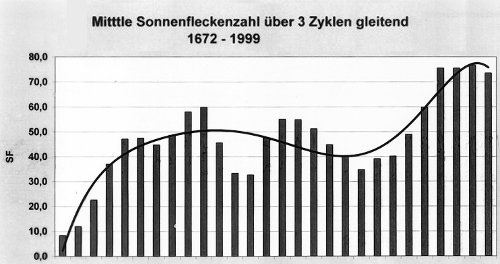 Abb. 9: Mittlere Sonnenfleckenzahl über drei Sonnenfleckenzyklen gleitend, 1672-1999.