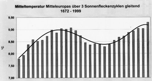 Abb. 8: Mitteltemperatur Mitteleuropas über drei Sonnenflecken-Zyklen gleitend, 1672-1999.
