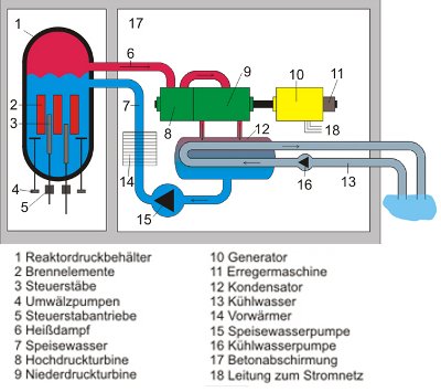 Der Unterschied ist also der, daß der Druckwasserreaktor im eigentlichen Kernreaktor nur Wasser hat, und der Siedewasserreaktor davon einen Teil verdampft. Beide Kraftwerke arbeiten ungefähr bei 350°C.