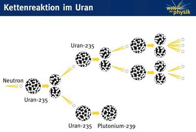 Diese freien Neutronen müssen jetzt wieder ein neues Uran-235 finden, damit der Prozeß weitergeht. Wenn sie keines finden, bleibt die Reaktion stehen; es wird eine Mindestmasse gebraucht, damit mindestens ein freigesetztes Neutron ein Uran-235 findet. Diese Masse nennt man die kritische Masse.