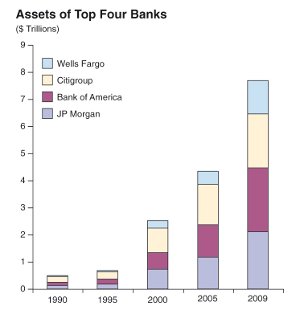 Das Vermögen der führenden amerikanischen Großbanken hat sich infolge der Abschaffung des Glass-Steagall-Standards explosionsartig vermehrt - vor allem durch Fusionen und Übernahmen.
