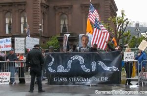 „Glass-Steagall oder Tod!“: Mitglieder des LaRouche-Aktionskomitees bei einer Protestdemonstration gegen Präsident Obama in San Francisco.