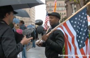 LPAC-Kandidat Summer Shields gibt ein Interview während der Protestdemonstration gegen Präsident Obama in San Francisco.