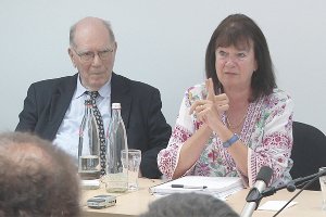 Lyndon LaRouche und Helga Zepp-LaRouche beim Frankfurter Seminar der Nachrichtenagentur EIR.