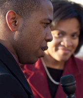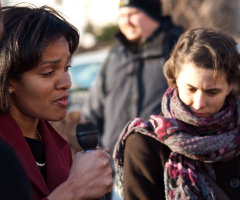 Kesha Rogers (links) aus Houston/ Texas bei einer Kundgebung des LaRouches-Aktionskomitees in Washington. Im Hintergrund Rachel Browns, die in Worcester/ Massachu- setts gegen "Bailout-Barney" Frank, den Vorsitzenden des Finanzdienst- leistungsausschusses, antritt.