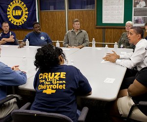 Präsident Barack Obama im Gespräch mit Vertretern der Automobilarbeiter-Gewerkschaft UAW: In den letzten 10 Jahren gingen die Hälfte aller Arbeitsplätze im Autosektor verloren.