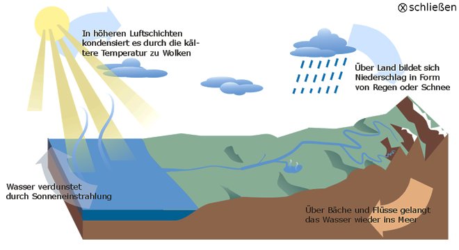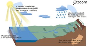 Der Wasserkreislauf wird häufig sehr grob vereinfacht wie auf dieser Grafik. Tatsächlich durchläuft das Wasser auf dem Weg zurück ins Meer zahlreiche Unterkreisläufe, in denen es von der Biosphäre genutzt wird.