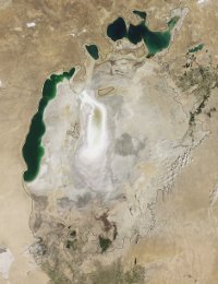 Der Aralsee im August 2009: Die dünne schwarze Linie markiert den Uferverlauf um 1960. Heute sind große Teile des Sees ausgetrocknet oder von einer weißen Salzkruste bedeckt (Bildmitte), nur am äußersten Nord- und Westrand sind noch - inzwischen stark salzhaltige - offene Seen verblieben.