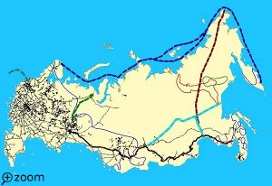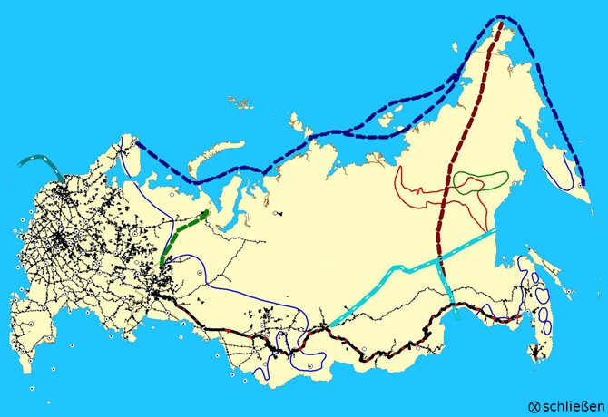 Das bestehende russische Eisenbahnnetz mit den (breit eingezeichneten) schon bestehenden und geplanten Entwicklungskorridoren am Ural, durch Sibirien und Jakutien bis hin zur Beringstraße.