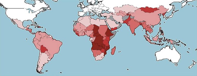 Weltkarte des Hungers, 2010. In den am dunkelsten gefärbten Ländern leiden mehr als 35% der Bevölkerung an chronischer Unterernährung.