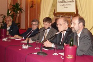 Andrew Spannaus (Bildmitte) bei einer Veranstaltung im Sommer 2007 mit (v.l.) dem heutigen italienischen Wirtschafts- und Finanzminister Giulio Tremonti, dem damaligen Staatssekretär Alfonso Gianni, Lyndon LaRouche und dem EIR-Journalisten Claudio Celani.