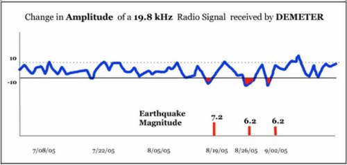 Nur eines von etlichen Beispielen, wie sich Erdbeben ankündigen: Durch die Analyse von Radiosignalen, die von Sendeanlagen auf der Erde abgegeben und vom französischen Demeter-Satelliten empfangen werden, ermittelt Prof. Pier Francesco Biagi von der Universität von Bari Veränderungen niederfrequenter Radiowellen im Bereich von 3-300 KHz in der Ionosphäre. Bei mehreren starken Erdbeben war die Stärke dieser Signale vorher außergewöhnlich niedrig.