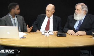 Sky Shields (links) berichtet im Weekly Report mit Lyndon LaRouche (Mitte) und Moderator John Hoefle über den aktuellen Stand der Erdbeben- und Weltraumforschung.