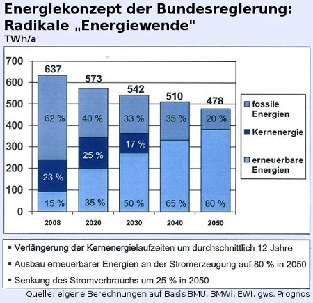 Ganz offensichtlich sollte also Hand in Hand mit der Einführung des Euro ein Strukturwandel in Gang gesetzt werden, der, wie aus dem obigen Zitat zu entnehmen ist, geplant war. Neun Jahre später, im September 2010 stellt die Bundesregierung ein Konzept vor, in welchem das gesteckte Ziel noch mal locker verdoppelt wird: CO2-Reduktion auf mindestens 80% bis 2050.
