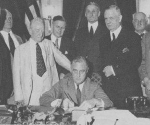 Unterzeichnung des Glass-Steagall-Gesetzes durch Präsident Roosevelt am 16. Juni 1933. Rechts von ihm Senator Glass, links der Abgeordnete Steagall.