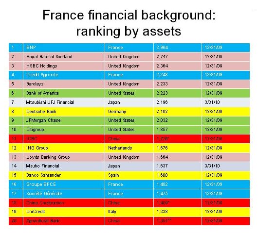 Aber wenn wir die Reihungsmethode ändern und die Rangfolge nach dem Vermögen, d.h., dem wirtschaftlichen Besitz der Banken, aufstellen (Tabelle 2), sehen wir, daß Chinas Banken weniger mächtig sind, und daß die erste amerikanische Bank in dieser Liste der Banken der Welt mit dem größten Vermögen, die Bank of America, erst an sechster Stelle steht. Die nach ihrem Vermögen mächtigsten Banken sind hier blau unterstrichen: Die BNP Paribas (Frankreich) mit 3300 Mrd. Dollar, dann kommt die Royal Bank of Scotland (Großbritannien) mit fast 3000 Mrd. Dollar Vermögen. An dritter Stelle stehr HSBC Holdings (Großbritannien), an vierter Stelle Crédit Agricole (Frankreich) und an fünfter Stelle Barclay’s Bank (Großbritannien).