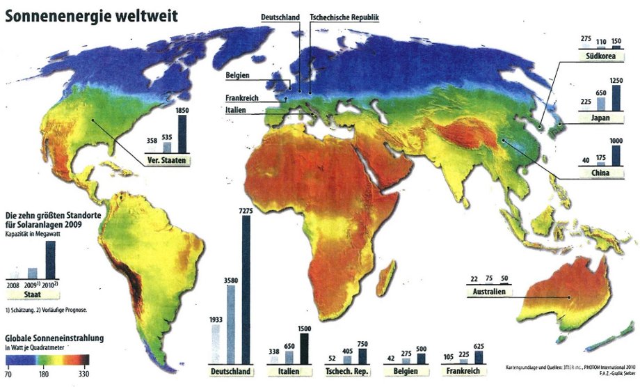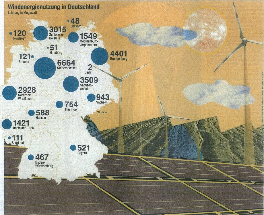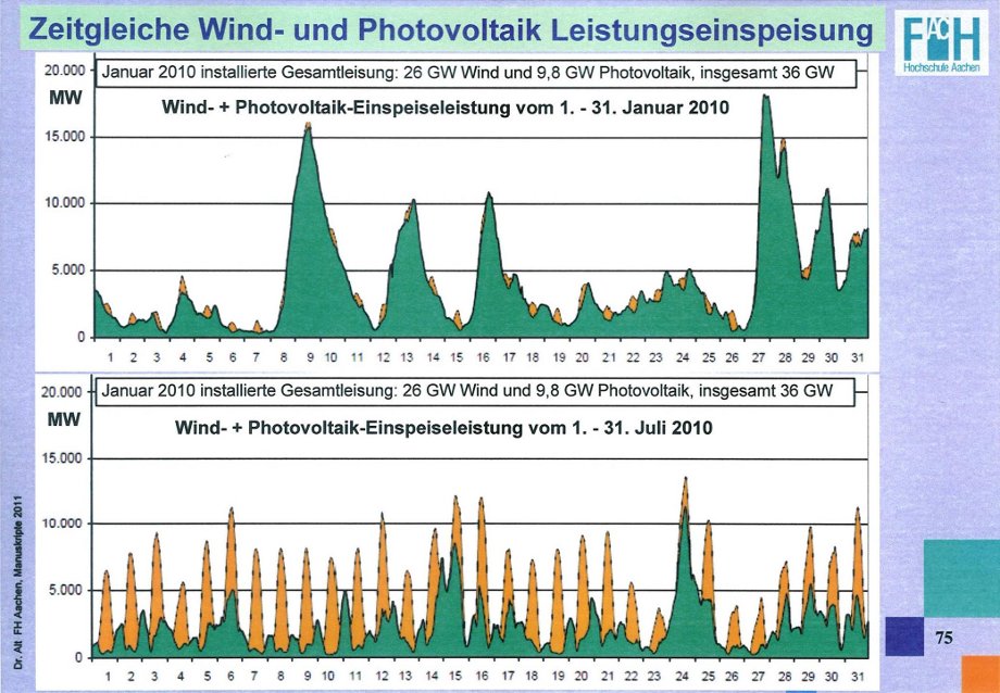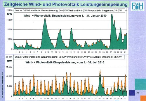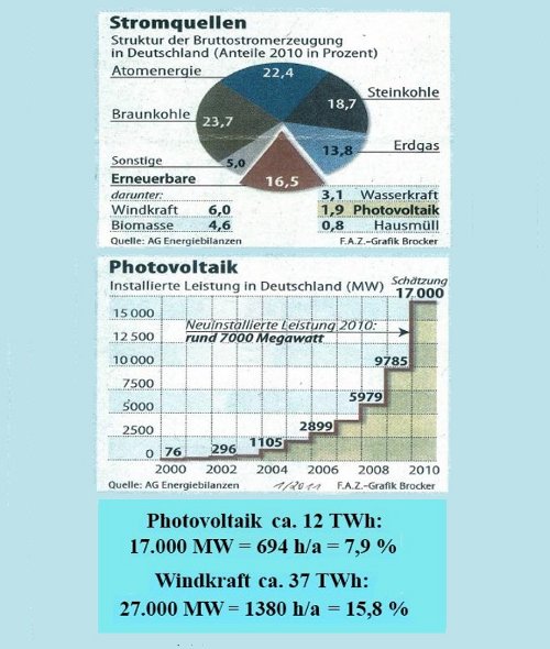 Unten im Bild sieht man auch: Die Photovoltaik hat in 2010 insgesamt 12.000 TWh geliefert; bei 17.000 MW installierter Leistung sind das 694 Stunden im Jahr, d.h. an 694 Stunden im Jahr haben die Photovoltaik-Anlagen die volle Leistung gebracht, das sind bloß 7,9%. Der Beitrag insgesamt kann sich somit nur auf knapp 10% belaufen. Bei der Windkraft sind die Zahlen etwas besser, sie steigen auf 15,8%, sind also etwa doppelt so groß.