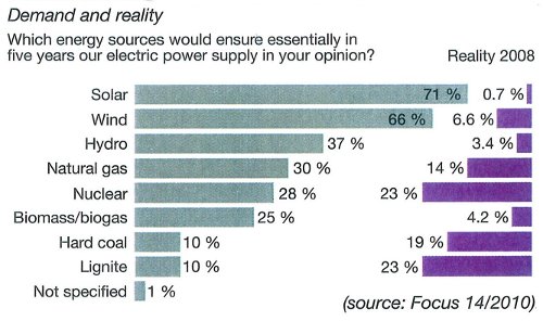 Eine solche Meinung ist aus den Medien entstanden. Die Medien vermitteln solche Eindrücke sehr schnell und überschwenglich, weil viele Journalisten auch grün denken. Der Wind soll sogar 66% bringen können, die Wahrheit sind 6,6%, die Wasserkraft 37%, die Nuklearenergie steht hier noch mit 28%, die Realität waren 23%. Das Bild in der Bevölkerung ist also ein völlig verkehrtes gegenüber der tatsächlichen Technik, die wir heute betreiben, und die wir auch für eine moderne Industriegesellschaft in Zukunft brauchen werden.“