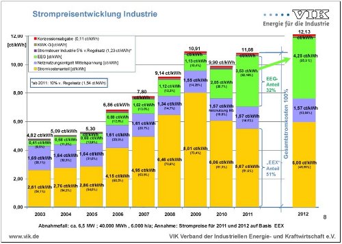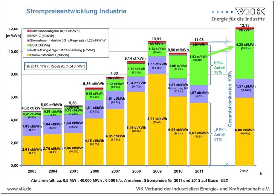 Für das Jahr 2012 werden 4,25 Ct/kWh als Belastung angegeben, aber da gibt es heute schon neuere Vorausberechnungen, wonach dieser Wert etwa in die Größenordnung von 6 Ct kommen wird, und damit wäre schon die Hälfte oder fast die Hälfte des Gesamtpreises erreicht.
