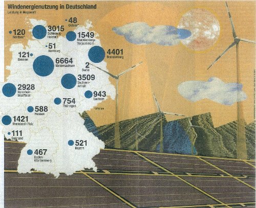 Zu Ihrer zusätzlichen Information: Natürlich sind die Windenergieanlagen im Norden stärker vertreten, Niedersachsen hat den größten Anteil (Abb. 13). Bayern hat bisher neben Baden-Württemberg und dem Saarland den geringsten Anteil, und hier wird man sicherlich in Zukunft in weitere Windkraftanlagen zur Verschandelung der Landschaft investieren müssen, um wenigstens einen eigenen Beitrag zu den 54% erneuerbare Energien für Bayern sicherstellen zu können.“