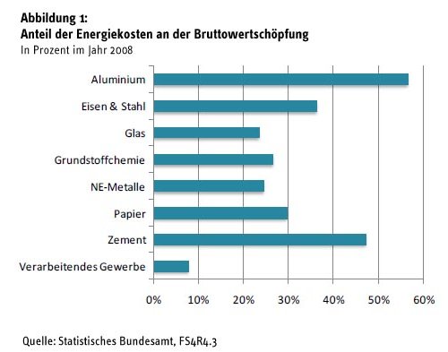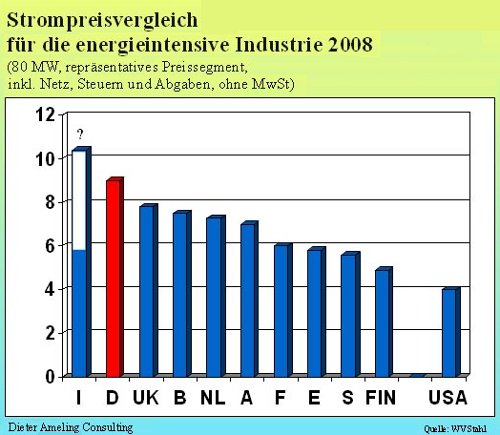 Schon jetzt seien die Industriestrompreise in Deutschland mit die höchsten: „Das hat klare Konsequenzen für den Strompreis der energieintensiven Industrien in Deutschland (Abb. 14). Wir hatten in Deutschland schon im Jahre 2008 mit 9 Ct fast den höchsten Strompreis für Industrieanlagen - bei einer hohen Abnahmeleistung, die da unterstellt ist -, und nur Italien hat, auf dem Papier, einen etwas höheren Wert, aber wir wissen aus Gesprächen mit den italienischen Kollegen, daß in Italien eine Rückvergütung von zuviel bezahltem Strom erfolgt, und über diese Rückvergütung fiele der Strompreis in Italien unter den von der deutschen Industrie zu bezahlenden Strompreis.“