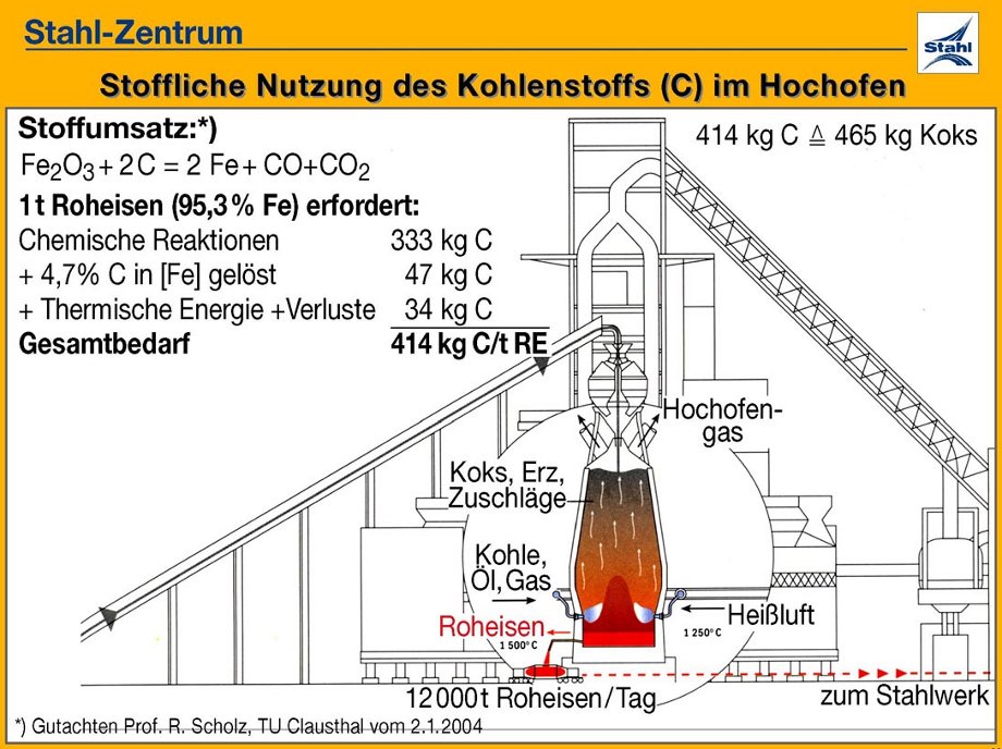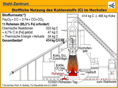 Dieses Bild (Abb. 15) zeigt einen Hochofen, der in dieser Ausführung für eine Tonne Roheisen etwa 414 kg Kohlenstoff braucht. Das ist physikalisch-chemisch nicht mehr zu unterbieten - genauso wie der Energieverbrauch für das Schmelzen einer Tonne Eis physikalisch definiert ist - tiefer kann man nicht kommen. Wenn man das in Koks umrechnet, sind das 465 kg Koks; wir liegen derzeit bei 490 kg insgesamt, d.h. nur sehr wenig von diesem Idealwert entfernt; wir haben also keine Chancen mehr, auf technischem Wege die CO2-Emissionen deutlich zu verringern.