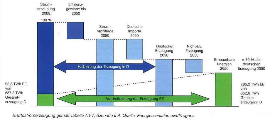 Ameling betonte: „Das sind ganz dramatische Ziele, die sich die Bundesregierung hier gesetzt hat“, und fuhr fort: „Es gibt eine Reihe von Energieszenarien, wie man den Energiebedarf bis zum Jahre 2050 verändern kann (Abb. 2). Da ist die Rede davon, daß die Stromnachfrage reduziert werden soll, daß wir Strom importieren in einer Größenordnung, die aus heutiger Sicht überhaupt nicht vorstellbar ist, und daß die deutsche Erzeugung, d.h. die nicht erneuerbare Energieerzeugung, drastisch reduziert wird, woraus sich der letzte Abschnitt ergibt: Erneuerbare Energien bis zum Jahre 2050 etwa in der Größenordnung, wie es hier dargestellt ist. Im Jahre 2008 hatten wir etwa 92 TWh erneuerbare Energien, was sich auf etwa 285 TWh erhöhen, also mehr als verdreifachen, fast vervierfachen soll.