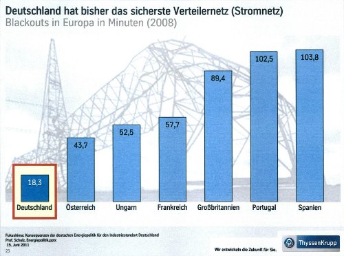 Ein zweiter Aspekt sei die Frage der Energiesicherheit: „Deutschland hat bisher das sicherste Verteilernetz, keine Frage (Abb. 3). Wir haben in Deutschland einen Ausfall an Energie von nur 18,3 Minuten im Durchschnitt. Sehr viel unsicherer ist die Situation heute schon in Österreich, auch in Ungarn und Frankreich, noch unsicherer in Großbritannien, Portugal und Spanien. Wir werden hier mit Sicherheit deutlich schlechter werden, wir werden deutliche Einbußen in der Sicherheit der Energieversorgung, in der Sicherheit der Versorgung mit elektrischem Strom erleben.“