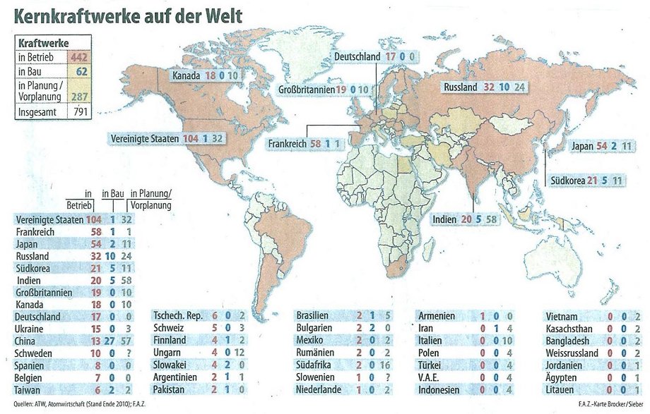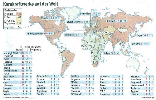 Ameling wies darauf hin, daß Kernkraftwerke auch weiterhin - trotz Fukushima - auf der ganzen Welt weiterbetrieben werden, „daran gibt es keinen Zweifel. Abb. 5 zeigt eine Aufstellung aller Kernenergieanlagen, die wir auf der Welt haben; es waren zum Zeitpunkt des Ausstiegs und zum Zeitpunkt des Problems in Fukushima 442 Kernkraftwerke, 62 neue im Bau, und 287 in der Planung. Das würde insgesamt dazu führen, daß demnächst 791 Anlagen betrieben würden, wobei sich sicherlich Änderungen ergeben werden; unter anderem müssen wir natürlich die in Deutschland betriebenen von dieser Bilanz entsprechend abziehen. Man sieht auch die Verteilung der Kernkraftwerke über die Staaten der Welt: Die größte Zahl von Anlagen sind mit 104 in den Vereinigten Staaten im Betrieb, Frankreich ist mit 58 an Nummer 2, und Japan hat - mit Fukushima - 54 Kernenergieanlagen, die Strom erzeugen.“