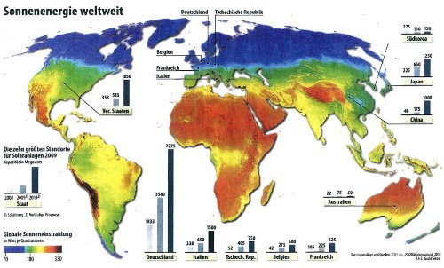 Das entsprechende Wunschbild zu diesem Thema heißt Desertec, d.h. die Sonne Nordafrikas soll den Strombedarf der Welt decken; sie könnte es zwar, aber es gibt dabei das Problem, den Strom wirtschaftlich aus dieser Region nach Deutschland zu transportieren. Die dafür notwendigen Leitungen über mehr als 3000 km produzieren so hohe Verluste, daß sich das mit sehr hoher Wahrscheinlichkeit nicht rechnen wird.