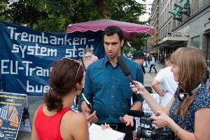 Am 13. August demonstrierte die BüSo in Berlin für die Einführung des Trennbankensystems, dessen Funktionsweise der Spitzenkandidat Stefan Tolksdorf Bürgern und Journalisten erläuterte.