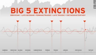 Anders gesagt, man kann feststellen, daß die Artenvielfalt auf der Erde ein Auf und Ab durchläuft und dieser Prozeß auf einen speziellen Punkt des 62-Millionen-Jahre-Zyklus zuläuft. Nicht jeder 62-Millionen-Jahre-Zyklus ist mit einer Massenextinktion verbunden, doch bei den fünf Ereignissen, wo dies der Fall war, gibt es einen klaren Zusammenhang zwischen dem Zeitablauf des Zyklus und der Periode des Massenaussterbens.