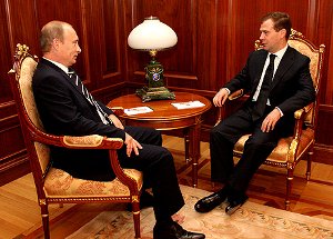 Rußlands Präsident Dmitrij Medwedjew und Ministerpräsident Wladimir Putin schlossen ein Bündnis für die kommenden Wahlen gegen das Britische Empire.