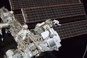 Die Astronauten Greg Chamitoff und Andrew Feustel im Außeneinsatz („Spacewalk“) an der Internationalen Weltraumstation.