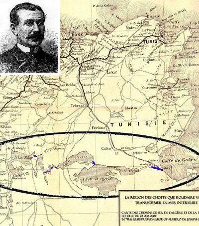 Roudaire war sich sicher, daß er eine riesige von Salzsümpfen bedeckte Senke, die sogenannten Schotts, entdeckt hatte, die sich über fast 400 km von Algerien bis zum Golf von Gabès in Tunesien erstreckte. (Abb. 1).