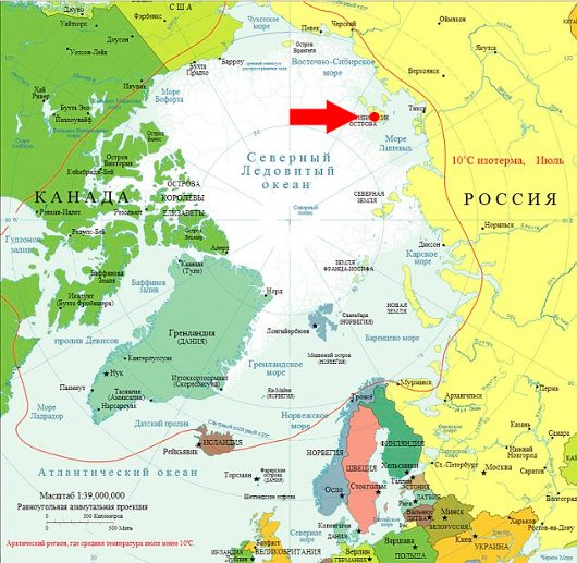 Die Markierung weist auf die Insel Kotelny, auf der die Stadt Umka gebaut werden soll.
