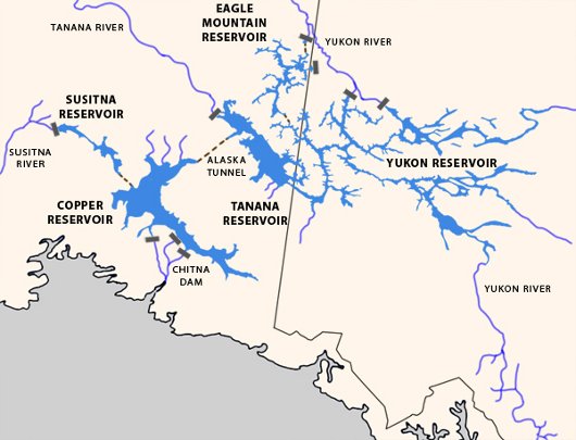 Betrachten wir zunächst etwas genauer, was dies in Alaska bedeutet (Abbildung 7). Das ist es, worum es hier geht, dieses Gebiet an der Grenze zwischen Alaska und Kanada. Sie sehen hier dieses System von Reservoirs. Nun, das wird einiges an Bauten erfordern, die es bisher im Bundesstaat Alaska und Nordkanada nicht gibt. Insgesamt müssen sechs Staudäme errichtet werden, drei davon mehr als 330 m hoch. Um die Arbeiter und das Baumaterial dorthin zu schaffen, müssen allein in Alaska ca. 5000 km an Eisenbahnstrecken gebaut werden, und etwa 11.000 km in Nordkanada, außerdem vier weitere Staudämme in Nordkanada. Das sind gewaltige Baumaßnahmen, für die die Entwicklung mehrerer wichtiger Städte notwendig ist, um die Arbeitskräfte, die an diesen Bauten beteiligt sind, unterzubringen.