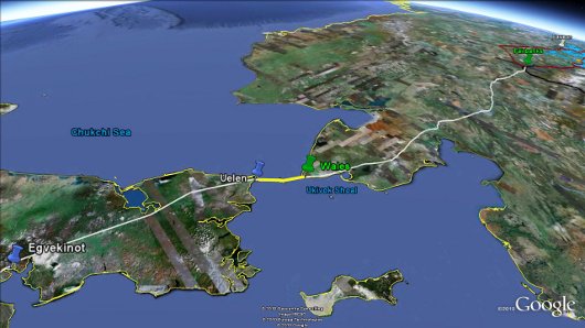 Nun, sie erkennen, was wir vorhin schon gesagt haben: Dies wird zusammenkommen mit den Baumaßnahmen, die derzeit in Rußland, im Fernen Osten und im Norden, verrichtet werden. Und das ergibt dann eine ganz andere Sicht der Welt. Hier im nächsten Bild (Abbildung 9) sehen Sie eine Darstellung der Entwicklung der Beringstraße, eine Ansicht der Region, über die wir hier reden und in der einige der wesentlichen Städte gebaut werden, von oben. Hier rechts ist Alaska, Nordsibirien ist auf der linken Seite. Hier sehen sie die Diomeden-Inseln - die große Diomeden-Insel und die kleine Diomeden-Insel.