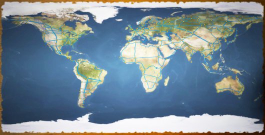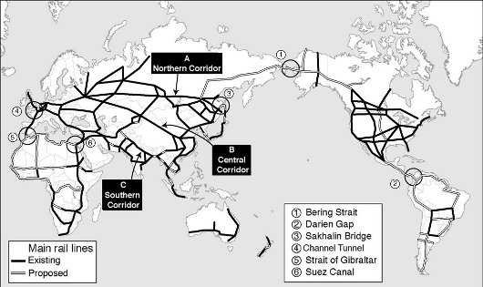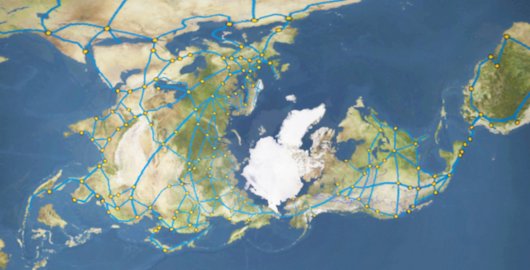 Nun, spielen wir die Animation weiter. Die Verbindung, über die wir hier reden, gibt uns einen anderen Eindruck von „nah“ und „fern“. Tatsächlich, wie Sie hier bemerken werden, verläuft der kürzeste Weg von Europa nach Nordamerika durch diese Region hier, über die Polarregion. Nun, mit dieser Eisenbahnverbindung und dem, was auf dieser Karte noch nicht verzeichnet ist, was man sich aber vorstellen kann, gibt es drei wichtige Handelsrouten durch diese Polarregion, die sich jetzt aufgrund des Abschmelzens des Eises im Arktischen Meer eröffnen. Die eine, die Nordmeerroute, verläuft entlang der russischen Küsten von Europa und den Häfen im russischen Nordwesten um Rußland herum und folgt im wesentlichen der gleichen Route, die wir für die Eurasische Landbrücke vorgesehen haben, zur Beringstraße und dann, möglicherweise, durch die Beringstraße hindurch zur Pazifikküste der Vereinigten Staaten oder über die Nordwestpassage durch Nordkanada hinüber zum Atlantik.