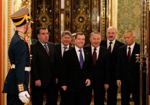 Die Staatspräsidenten der Mitgliedstaaten der „Gemeinsamen Sicherheitsorganisation“ (CSTO) diskutierten bei ihrem Treffen am 20. Dezember über die angespannte Lage in Südasien (v.l.): Emomali Rahmon (Tadschikistan), Almasbek Atambajew (Kirgistan), Sersch Sargsyan (Armenien, verdeckt), Dmitrij Medwedjew (Rußland), Nursultan Nasarbajew (Kasachstan), Alexander Lukaschenko (Weißrußland) und Islam Karimow (Usbekistan)