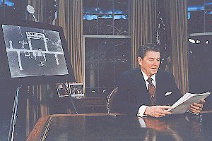 US-Präsident Ronald Reagan bei seiner Fern- sehansprache vom 23. März 1983, in der er der Sowjet- union die gemeinsame Entwicklung von Raketen- abwehrsystemen anbot, um die nukleare Bedrohung aus der Welt zu schaffen.