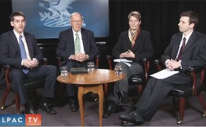 Die Diskussionrunde im Studio: (v.l.) LPAC-Moderator Matthew Ogden, Lyndon LaRouche und die Kongreßkandidaten Diane Sare und Bill Roberts