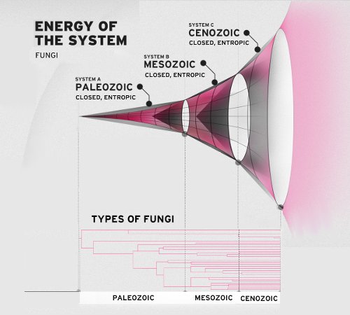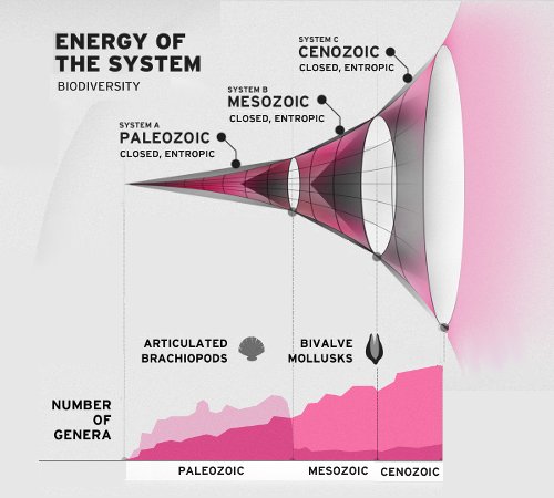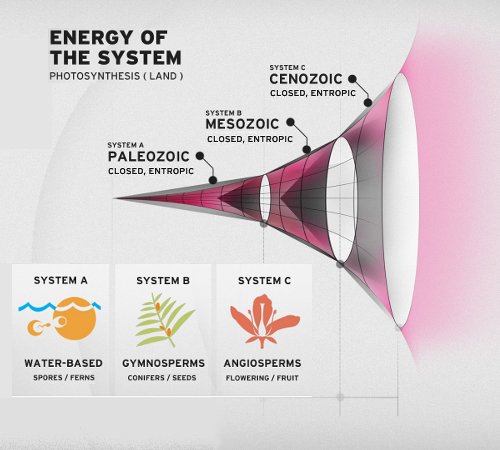 Die beiden Massenextinktionen stechen als eindeutige Wendepunkte in der Entwicklung des ganzen Systems hervor. Es läßt sich ein erstes Prinzip erkennen, das während des gesamten Prozesses wirksam ist: Die Energie des Gesamtsystems steigt ständig an. Der Zuwachs ist jedoch nicht graduell, sondern es gibt plötzliche Wendepunkte, wo das System in einen neuen Zustand übergeht. Wie wir in früheren Beiträgen und an anderer Stelle auf unserer Webseite dargestellt haben, funktioniert dies in der Biosphäre so, daß das neues System bereits in dem früheren System angelegt ist, bis das neue System an einer bestimmten Stelle das vorige System übernimmt.