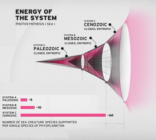 Es gibt verschiedene Möglichkeiten festzustellen, wie sich die Gesamtenergie des Systems erhöht; ein Maß, das man wählen kann, ist zum Beispiel, wenn man vergleicht, wie viele höhere Lebensformen von den einzelnen photosyntheseaktiven Arten in den Meeren ernährt werden können. Wie man sieht, hat sich dies im Übergang von einem System zum anderen ständig erhöht: von etwa 5 Arten auf 10 Arten und dann 60 Arten. Das heißt, je größer die photosynthetische Basis wurde, desto mehr höher und komplexer entwickelte Lebewesen, ja ganze Lebenssysteme, konnten ernährt werden.