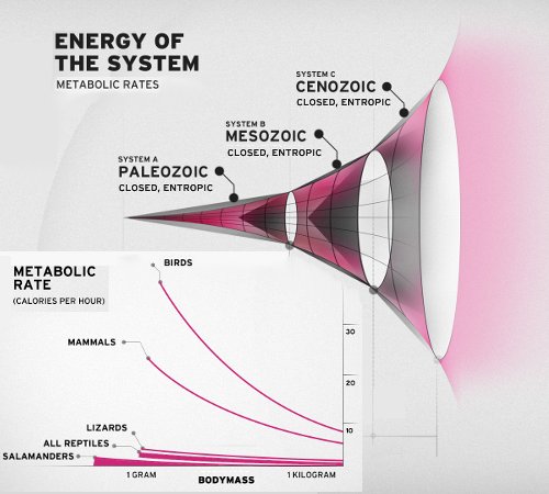 Man sieht, daß diese Tiere jeweils Ausdruck der Arten von Lebewesen sind, die in den früheren Epochen gelebt haben. Nach dem KT-Massenaussterben waren die Säugetiere zum dominierenden System geworden; die Reptilien dominierten nach dem PT-Massenaussterben. An der Zunahme der Stoffwechseltätigkeit wird deutlich, daß dieser Prozeß ein eindeutiger Ausdruck des ständig wachsenden Energieverbrauchs pro Art gewesen ist. Aber auch der tatsächliche Energiedurchfluß in Form von Atmung, Nahrungsaufnahme und allem, was für die Versorgung des Organismus notwendig ist, ist Ausdruck des schnelleren Umsatzes und der Höherentwicklung dieser Systeme.