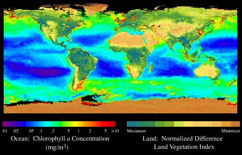 Auf einer Weltkarte wie dieser, die die NASA und auch andere Einrichtungen veröffentlicht haben, sieht man die globale Verteilung photosynthetischer Aktivitäten (Abbildung 2). Auch heute noch gibt es riesige Gebiete, wo praktisch keine Photosynthese stattfindet - etwa in den Wüsten. Die meisten kennen die Große Amerikanische Wüste, in der sich mit dem NAWAPA-Projekt einiges verändern und entwickeln ließe, aber auch die Sahara in Afrika. Aber wie man sieht, gibt es auch riesige Wüstenregionen in den Ozeanen.