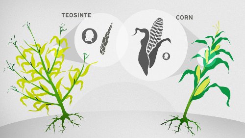 Aber der Mais, den wir heute kennen, ist kein Produkt der Biosphäre. Den Mais, den die Biosphäre hervorbrachte, würden nur sehr wenige heute lebende Menschen als Mais erkennen. Er ist ein kleines Gehölz namens Teosinte, das wie ein Büschel Stroh oder so etwas ausschaut. Es hat etwa 10 oder 12 Maiskörner, jedes in einer harten Schale eingeschlossen, die nur schwer zu knacken ist, um darin eine Art Fruchtfleisch zu finden. Sie wachsen überall auf dieser kleinen buschigen Pflanze, und man hat vor allem Stengel und harte Schalen, die nur sehr wenige Nährstoffe enthalten. Es ist viel Arbeit notwendig, um etwas Brauchbares daraus zu machen.
